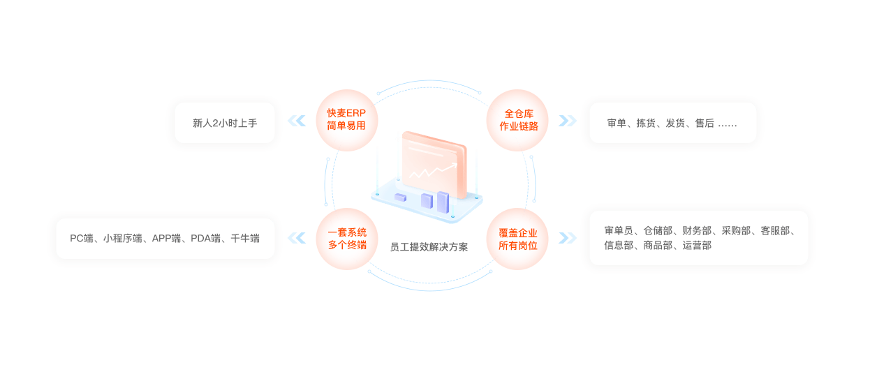 • 快麥ERP覆蓋全部門、全流程、全終端,實現企業系統化管理,幫助員工提升效率